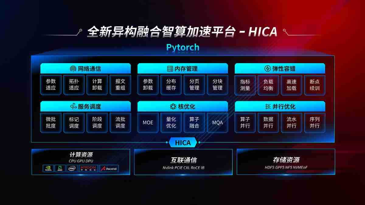 通过自研的服务层、、、中间适配层、、、、以及调度编排算法,,,,采用数据并行、、、模型并行等多种并行方式,,,把并行计算任务进行有效的分解,,,,使其分别由相应的软件栈和算力资源来承接。。当GPU资源变化,,HICA可以实时动态调度计算子任务并调整模型拓扑和架构,,,以充分聚合各种算力资源。。。
