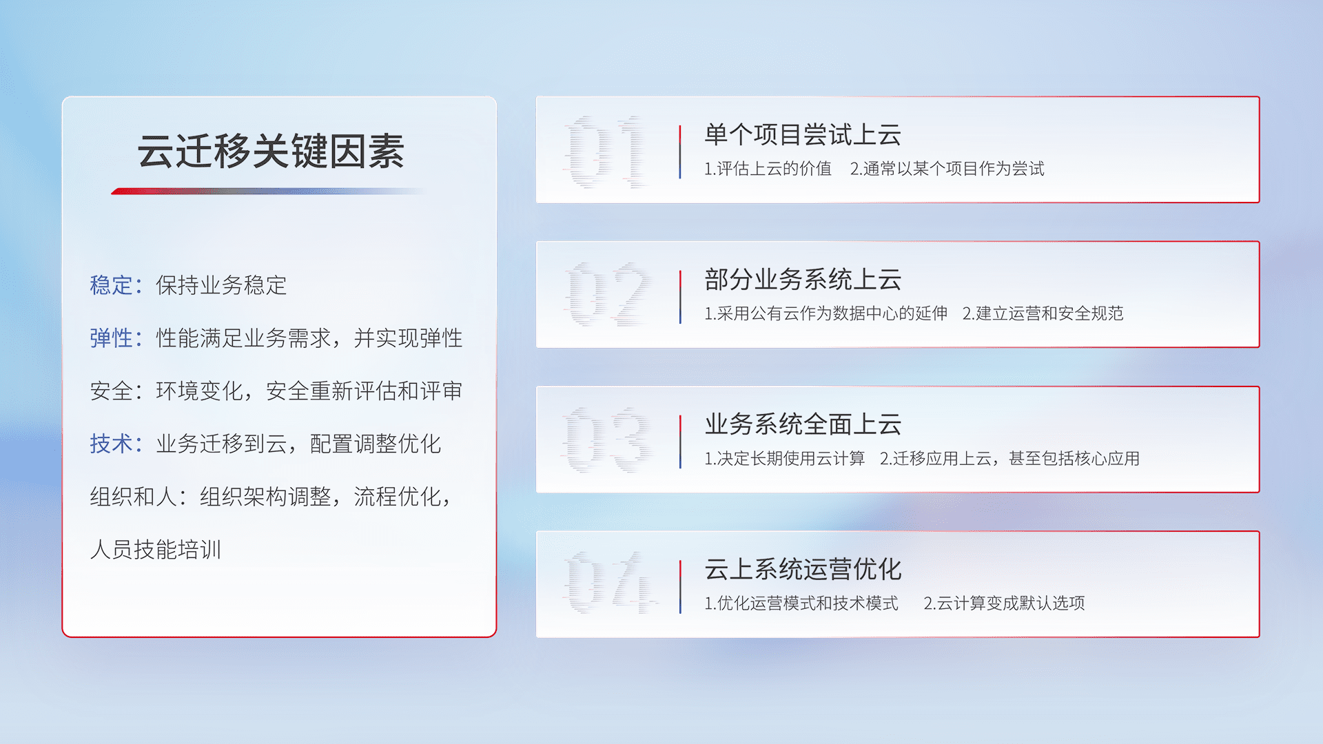 结合实际业务,,,从规划设计、、云平台选型、、、云原生改造、、、、数据迁移、、、集成交付,,,,迁移全过程为客户识别最佳上云路径,,做好风险识别管理,,,,设计网络架构、、、身份权限、、、、安全审计合规、、操作审计、、、、日志审计、、、监控告警策略、、多站点容灾设计等,,,,对云上基础设施进行整体规划,,提升IT治理水平,,以满足弹性、、、、高可用、、、高性能的需求。。