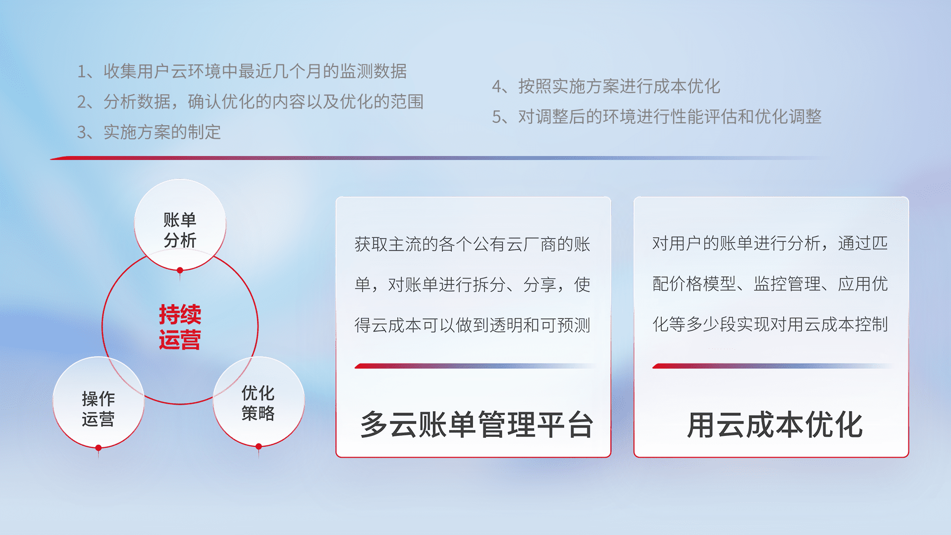 通过多云纳管,,,,以统一的资源数据模型把客户的云资源进行抽象和封装,,,,进而实现对多云资源的统一操作,,,保障云资源管理的可靠性、、、、稳定性与可用性。。。量身定制化运维内容,,,,配置、、开发运维、、、、补丁管理、、备份、、监控、、、、认证和访问管理、、、、审计和日常巡检等,,保障在用云过程中的可靠度,,,稳定度以及高可用率。。