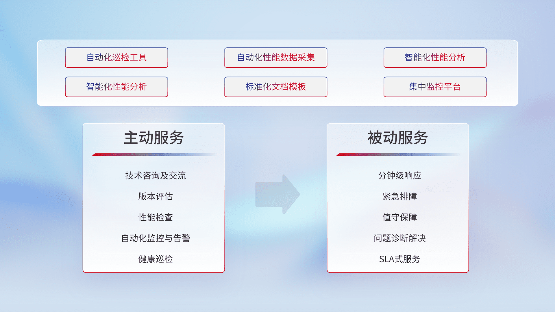 智能化工具和标准化文档,,,,保障服务质量,,,,提供主动服务(包含技术咨询、、、版本评估、、性能检查、、、自动化监控与告警、、、健康巡检)和被动服务包含(分钟级响应、、紧急排障、、值守保障、、问题诊断解决、、、、SLA服务)。。。